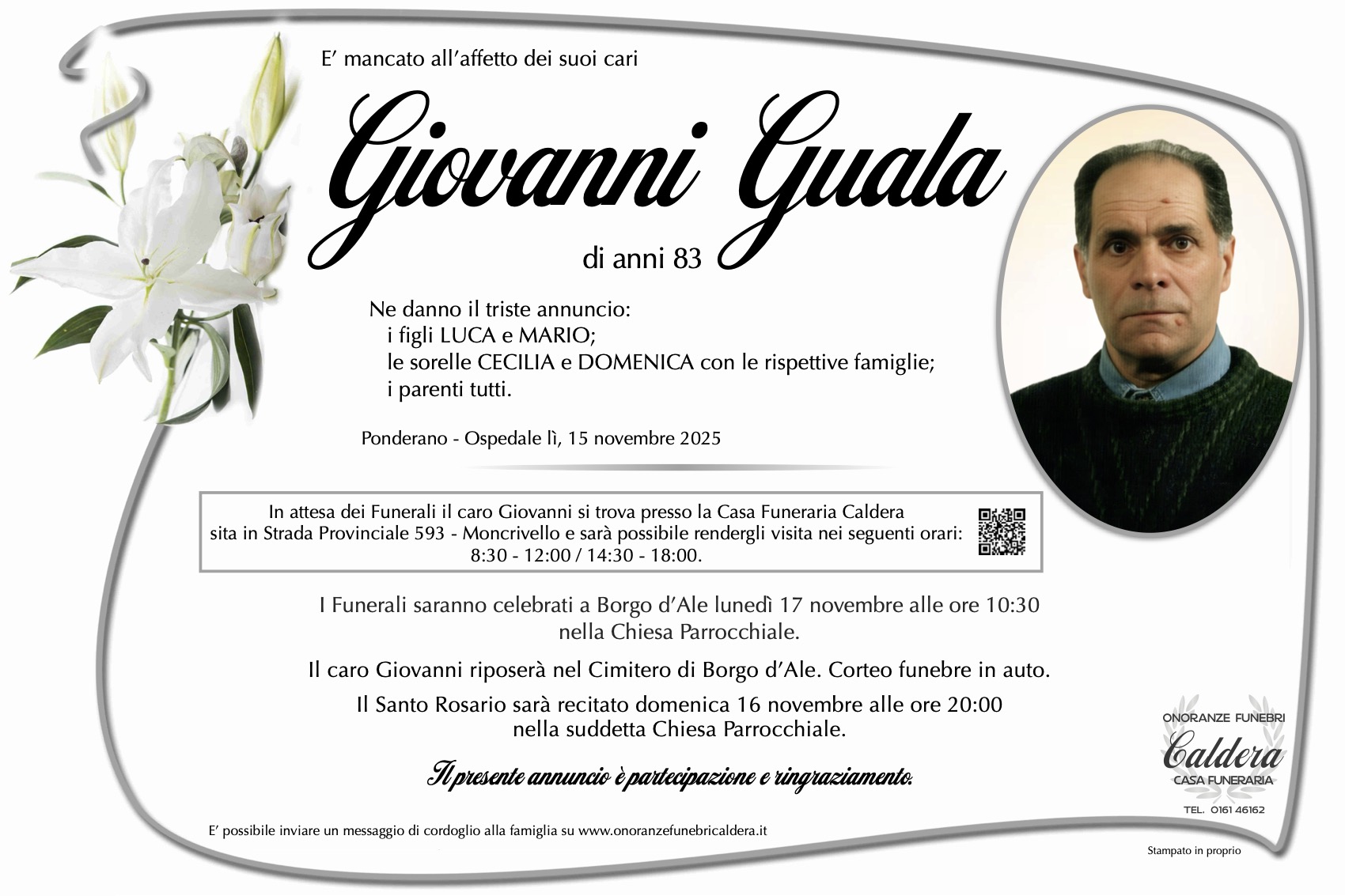 I familiari ringraziano anticipatamente tutti coloro che parteciperanno alla cerimonia funebre e tutti coloro che scriveranno con affetto un Pensiero di Ricordo.