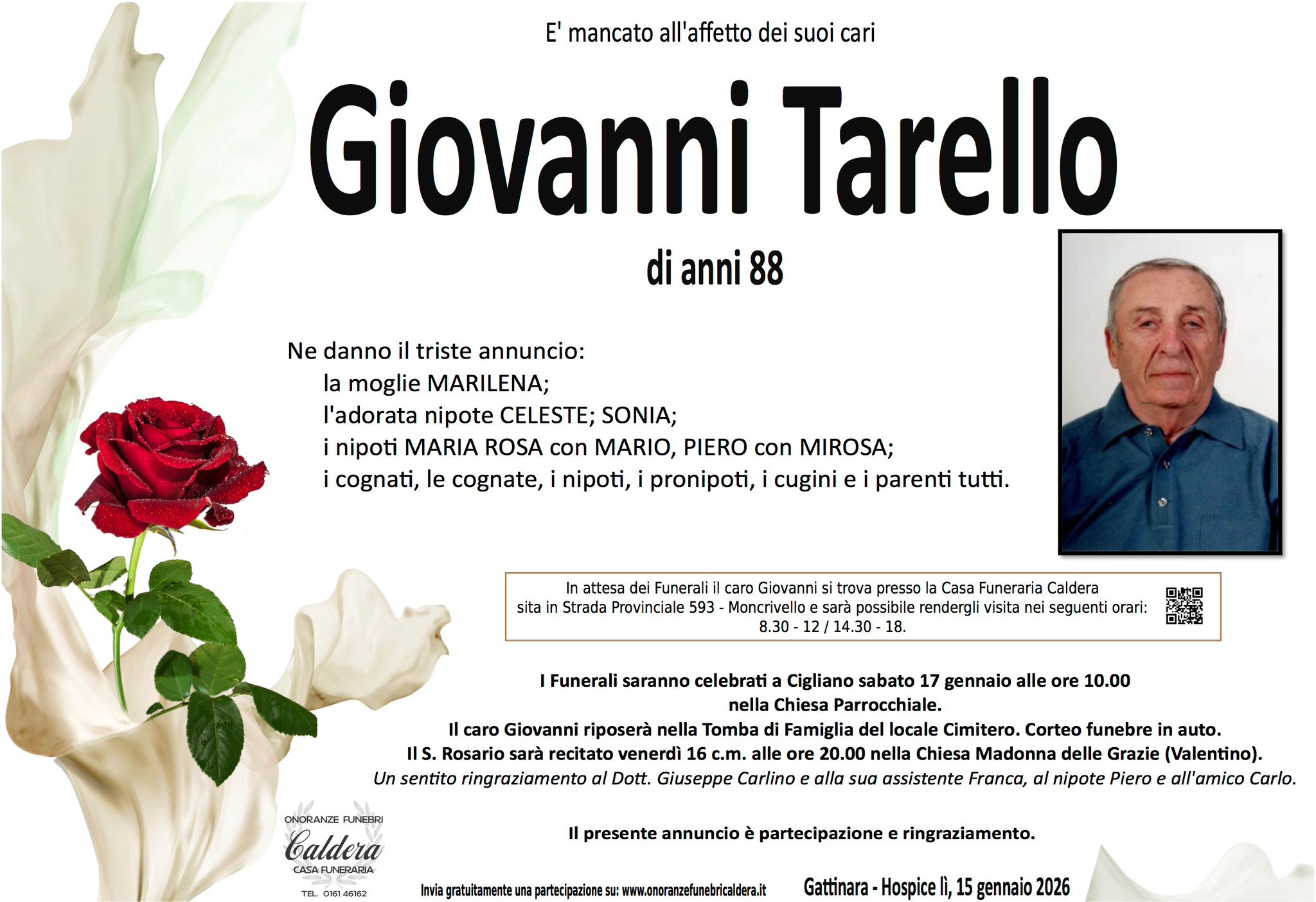 I familiari ringraziano anticipatamente tutti coloro che parteciperanno alla cerimonia funebre e tutti coloro che scriveranno con affetto un Pensiero di Ricordo.